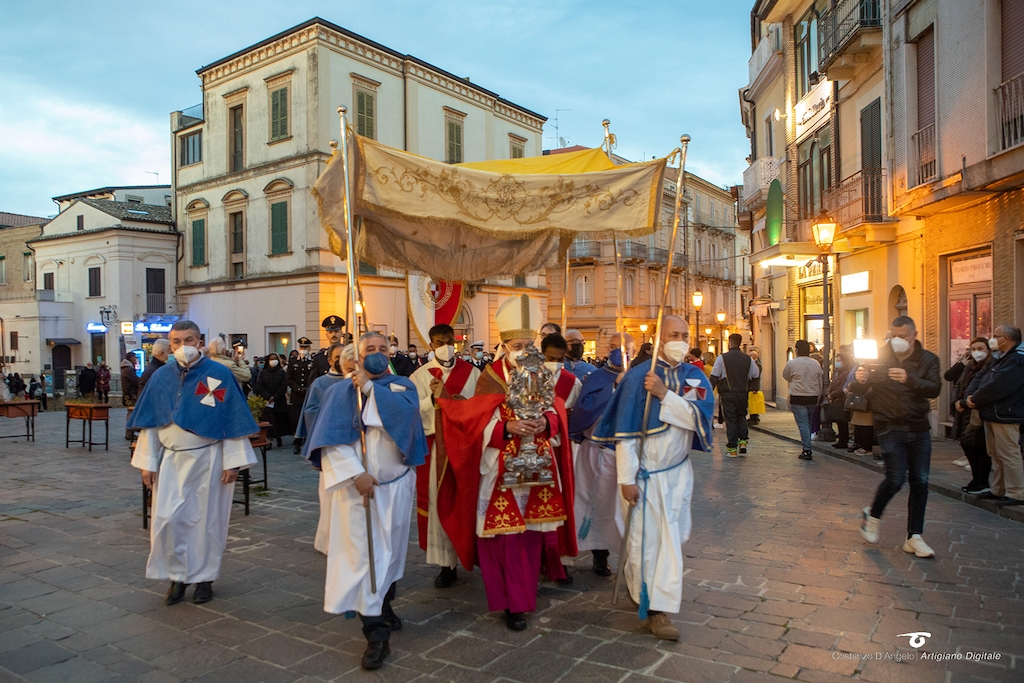 L’appuntamento più atteso era quello della solenne festa, vissuto con le attenzioni imposte dal periodo. Il percorso, che si è snodato lungo le vie del centro storico, è stato diverso rispetto al passato. Il lungo corteo è arrivato fino a via Adriatica. Lì, sulla balconata che si affaccia sul mare, monsignor Forte ha guidato la preghiera per la pace e per le persone che, per diversi motivi, vivono un periodo di sofferenza. Poi il passaggio in piazza Rossetti, via Cavour e corso Italia, prima di far rientro nella chiesa di Santa Maria maggiore, dove sulle note dell’Ave Spina, è terminata la celebrazione.