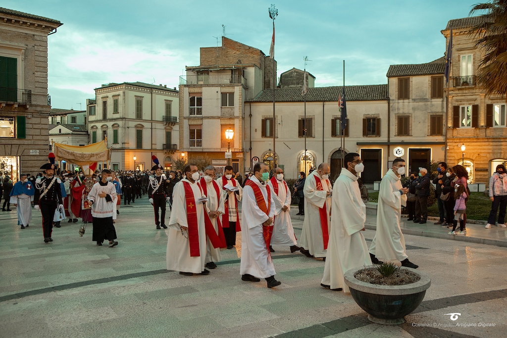 L’appuntamento più atteso era quello della solenne festa, vissuto con le attenzioni imposte dal periodo. Il percorso, che si è snodato lungo le vie del centro storico, è stato diverso rispetto al passato. Il lungo corteo è arrivato fino a via Adriatica. Lì, sulla balconata che si affaccia sul mare, monsignor Forte ha guidato la preghiera per la pace e per le persone che, per diversi motivi, vivono un periodo di sofferenza. Poi il passaggio in piazza Rossetti, via Cavour e corso Italia, prima di far rientro nella chiesa di Santa Maria maggiore, dove sulle note dell’Ave Spina, è terminata la celebrazione.