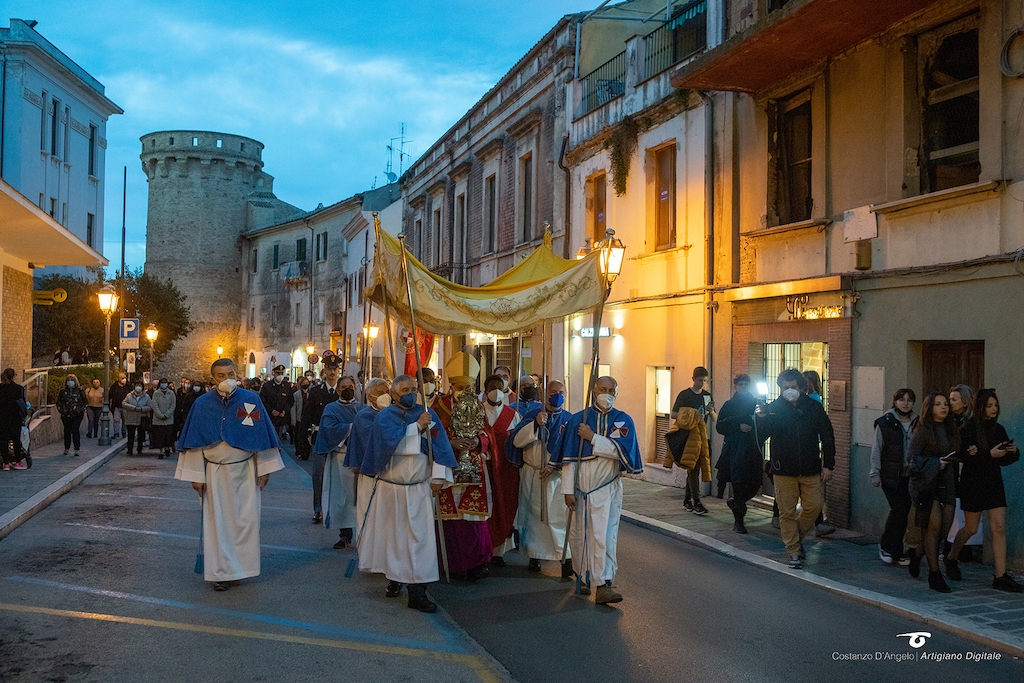 L’appuntamento più atteso era quello della solenne festa, vissuto con le attenzioni imposte dal periodo. Il percorso, che si è snodato lungo le vie del centro storico, è stato diverso rispetto al passato. Il lungo corteo è arrivato fino a via Adriatica. Lì, sulla balconata che si affaccia sul mare, monsignor Forte ha guidato la preghiera per la pace e per le persone che, per diversi motivi, vivono un periodo di sofferenza. Poi il passaggio in piazza Rossetti, via Cavour e corso Italia, prima di far rientro nella chiesa di Santa Maria maggiore, dove sulle note dell’Ave Spina, è terminata la celebrazione.