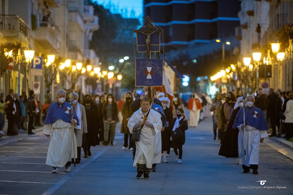L’appuntamento più atteso era quello della solenne festa, vissuto con le attenzioni imposte dal periodo. Il percorso, che si è snodato lungo le vie del centro storico, è stato diverso rispetto al passato. Il lungo corteo è arrivato fino a via Adriatica. Lì, sulla balconata che si affaccia sul mare, monsignor Forte ha guidato la preghiera per la pace e per le persone che, per diversi motivi, vivono un periodo di sofferenza. Poi il passaggio in piazza Rossetti, via Cavour e corso Italia, prima di far rientro nella chiesa di Santa Maria maggiore, dove sulle note dell’Ave Spina, è terminata la celebrazione.