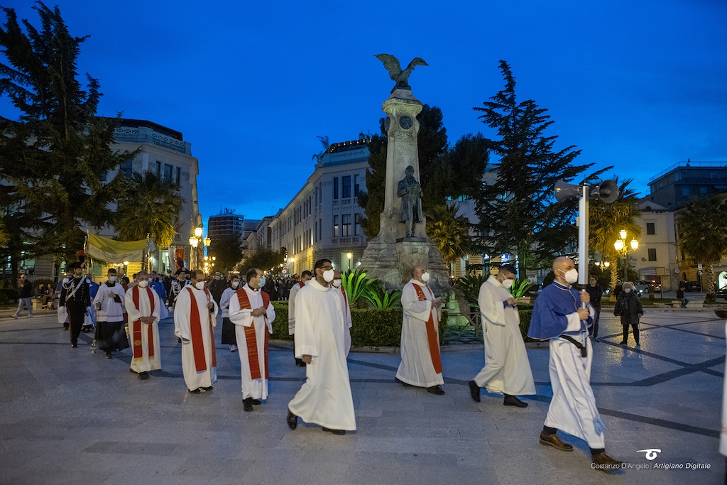 L’appuntamento più atteso era quello della solenne festa, vissuto con le attenzioni imposte dal periodo. Il percorso, che si è snodato lungo le vie del centro storico, è stato diverso rispetto al passato. Il lungo corteo è arrivato fino a via Adriatica. Lì, sulla balconata che si affaccia sul mare, monsignor Forte ha guidato la preghiera per la pace e per le persone che, per diversi motivi, vivono un periodo di sofferenza. Poi il passaggio in piazza Rossetti, via Cavour e corso Italia, prima di far rientro nella chiesa di Santa Maria maggiore, dove sulle note dell’Ave Spina, è terminata la celebrazione.