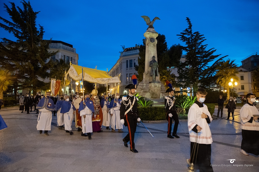 L’appuntamento più atteso era quello della solenne festa, vissuto con le attenzioni imposte dal periodo. Il percorso, che si è snodato lungo le vie del centro storico, è stato diverso rispetto al passato. Il lungo corteo è arrivato fino a via Adriatica. Lì, sulla balconata che si affaccia sul mare, monsignor Forte ha guidato la preghiera per la pace e per le persone che, per diversi motivi, vivono un periodo di sofferenza. Poi il passaggio in piazza Rossetti, via Cavour e corso Italia, prima di far rientro nella chiesa di Santa Maria maggiore, dove sulle note dell’Ave Spina, è terminata la celebrazione.