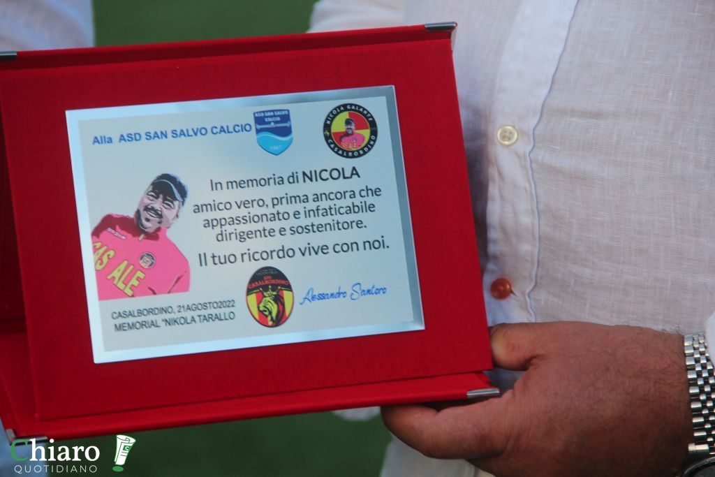 Tanta emozione in campo e sugli spalti, patron Alessandro Santoro ha fortemente voluto questo memorial, lui insieme a tanti amici lo hanno omaggiato. Prima dell’inizio del triangolare i tre capitani Della Penna, Altobelli e Luongo hanno voluto ricordare Galante ponendo un mazzo di fiori (portati dalla società sansalvese) sotto la sua gigantografia sempre presente sul sintetico casalese. Tra primo e secondo match il Casalbordino, per mano del dirigente Giuseppe Vaccaro ha omaggiato, con una targa ricordo, la famiglia di Nicola Galante (presenti i due nipoti e la sorella Pina) e i presidenti delle due società ospitate, Franco Bolami e Angelo Torzi. «In memoria di Nicola, amico vero, prima ancora che appassionato e infaticabile dirigente e sostenitore. Il tuo ricordo vive con noi», questa la frase scelta da patron Santoro per ricordare Galante.