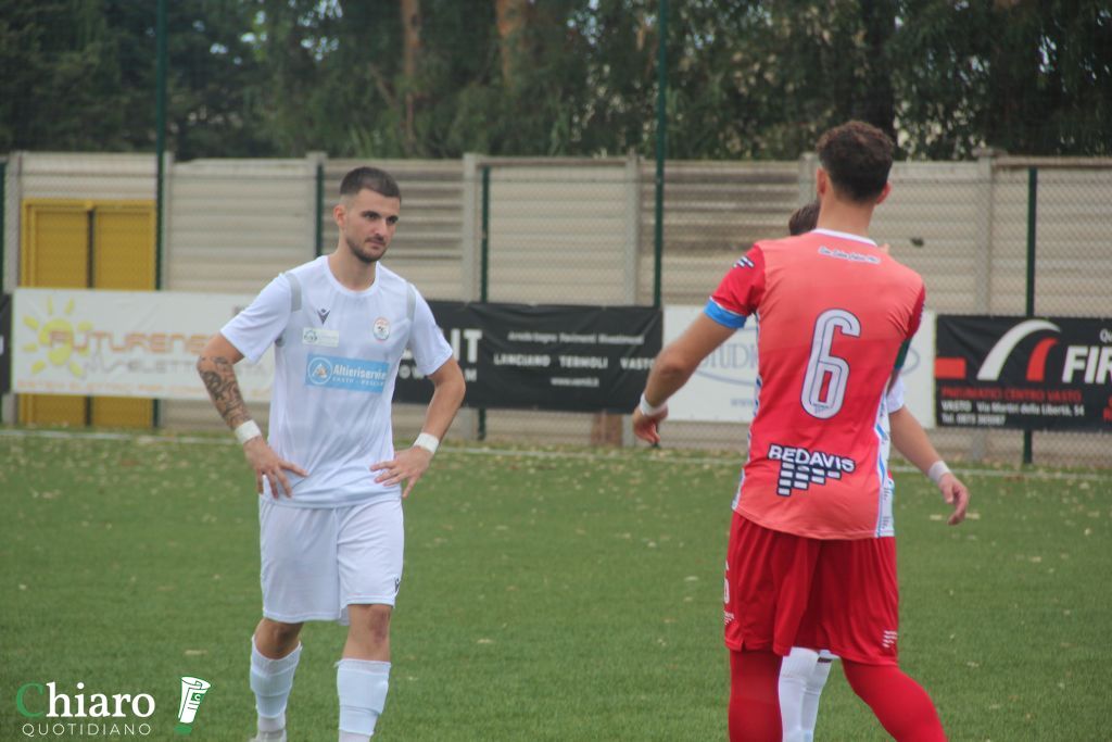 Proprio quest’ultimo in avvio è il protagonista, i vastesi non gestiscono al meglio un possesso, il bomberino biancazzurro (oggi di rosso vestito) non perdona e fredda l’estremo argentino.  I padroni di casa si scuotono immediatamente e reagiscono, su una conclusione a botta sicura sulla linea è decisivo De Lucia, poi Vasiu dice no ad Andrea Santone che ci prova anche da fuori ma non è fortunato. Sansalvesi più da battaglia e bravi a difendere il prezioso vantaggio ma i padroni di casa nel finale di primo tempo hanno l’occasionissima per il pari. Il fischietto lancianese punisce Triglione, reo di aver toccato la sfera in area con la mano, lo ammonisce e indica il dischetto. Dagli undici metri di presenta Shipple ma c’è Elvis Vasiu che intuisce l’angolo e fa di nuovo felici i biancazzurri.