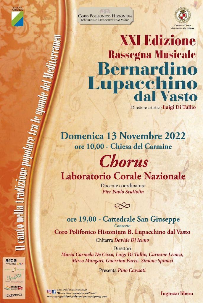 Domenica 13 novembre alle ore 19 nella Cattedrale di San Giuseppe a Vasto, ci sarà un nuovo appuntamento insertito nella XXI Edizione della Rassegna Musicale “B. Lupacchino dal Vasto”. Il Coro Polifonico Histonium “B. Lupacchino dal Vasto” sarà protagonista del concerto che seguirà il laboratorio corale nazionale del mattino. Il concerto sarà accompagnato dalla chitarra di Davide Di Ienno.