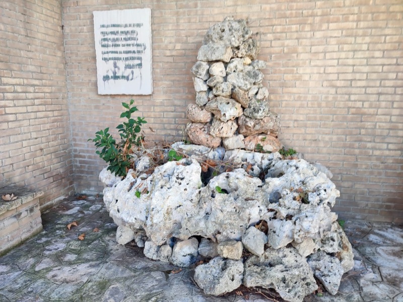 La fontana senz’acqua si trova nel centro di Vasto Marina. Negli anni Ottanta fu un bar all’incrocio tra via Donizetti e via Zara. Poi fu abbattuto e quello spazio a due passi sul lungomare rimase terra di nessuno fino al 1998, quando il Comune fece costruire una fontana fatta di scogli e tre sedili in mattoni. Poi ci si accorse che lo zampillo funzionava male: l’acqua non cadeva nella piccola vasca sottostante, ma per terra, allagando tutta l’area antistante. Allora la fontana fu chiusa e rimase solo quel cumulo di massi. Per giustificare la presenza della fontana senz’acqua, fu installata una lapide su cui è inciso il ritornello della canzone dialettale Tutte e funtanelle. Ma i vandali presero di mira anche quella, oscurandola con lo spray nero.