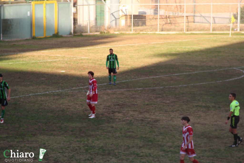 Poco più di sessanta secondi e i biancorossi sbloccano subito il match, dalla sinistra punizione calciata da Boito, a centro area nasce un flipper che fa felici i padroni di casa con la sfortunata autorete di De Min. Gli ospiti reagiscono e premono forte, tra il settimo e l’ottavo minuto doppia occasionissima per Quarta, sul primo salva tutto Del Giudice, poi è miracoloso il salvataggio sulla linea di porta di Lonati che si presenta come meglio non poteva davanti ai suoi nuovi tifosi. Al dodicesimo è ancora Quarta a provarci ma la sua girata è facile preda dell’uno di casa. Al ventiduesimo il gioco si ferma per oltre tre minuti a causa di un buco alla porta difesa da Del Giudice sotto la Curva d’Avalos, il portiere di casa prende sulle spalle capitan Cauterucci che sistema il problema alla porta facendo riprendere la partita. La partita è sempre nelle mani degli ospiti, le occasioni latitano e al trentottesimo una scaramuccia in area costringe il fischietto lancianese ad ammonire Valiente e Menna.