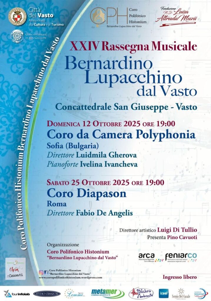 «Nel fine settimana avrà inizio la 24esima edizione della Rassegna musicale Bernardino Lupacchino dal Vasto. L’evento, organizzato dal Coro Polifonico Histonium con la direzione artistica di Luigi di Tullio, è diventato nel corso degli anni un appuntamento tradizionale e un punto di riferimento per la promozione e divulgazione del canto corale. La rassegna prenderà il via domenica 12 ottobre 2025 alle ore 19 nella Concattedrale di San Giuseppe e vedrà la partecipazione del Coro da Camera Polyphonia di Sofia (Bulgaria)». Lo annuncia un comunicato del Comune di Vasto.