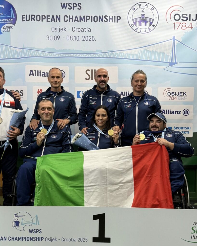 Medaglie d’oro che parlano anche abruzzese grazie a Giulia Valdo, paralimpica sulmonese protagonista nella gara a squadre di pistola libera 50 metri P4. In Croazia l’abruzzese ha scritto la storia insieme ai compagni Davide Franceschetti e Marco Pusinich ma anche nella pistola a 10 metri femminile è riuscita a firmare il nuovo record italiano (7° posto assoluto agli Europei).
