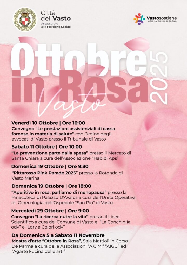 «Anche quest’anno Vasto, attraverso l’assessorato alle Politiche sociali, promuove il calendario di iniziative di Ottobre in Rosa 2025, un mese dedicato alla prevenzione, alla salute e al benessere femminile». Lo comunica una nota del municipio.