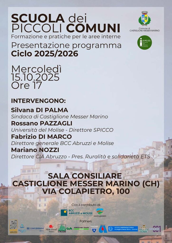 La Scuola dei piccoli comuni vede come partner principali Anci, Uncem, Unpli, Slow Food, Cia-Agricoltori Italiani, Confcooperative, Avis e Cai, nonché l’Istituto Comprensivo di Castiglione. Per rendere più stabile tale esperienza si è costituita quest’anno l’associazione Scuola dei Piccoli Comuni – Spicco, presieduta da Nicholas Tomeo, originario di Castiglione Messer Marino e ricercatore all’Università del Molise.