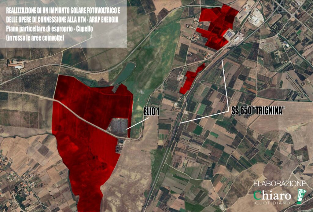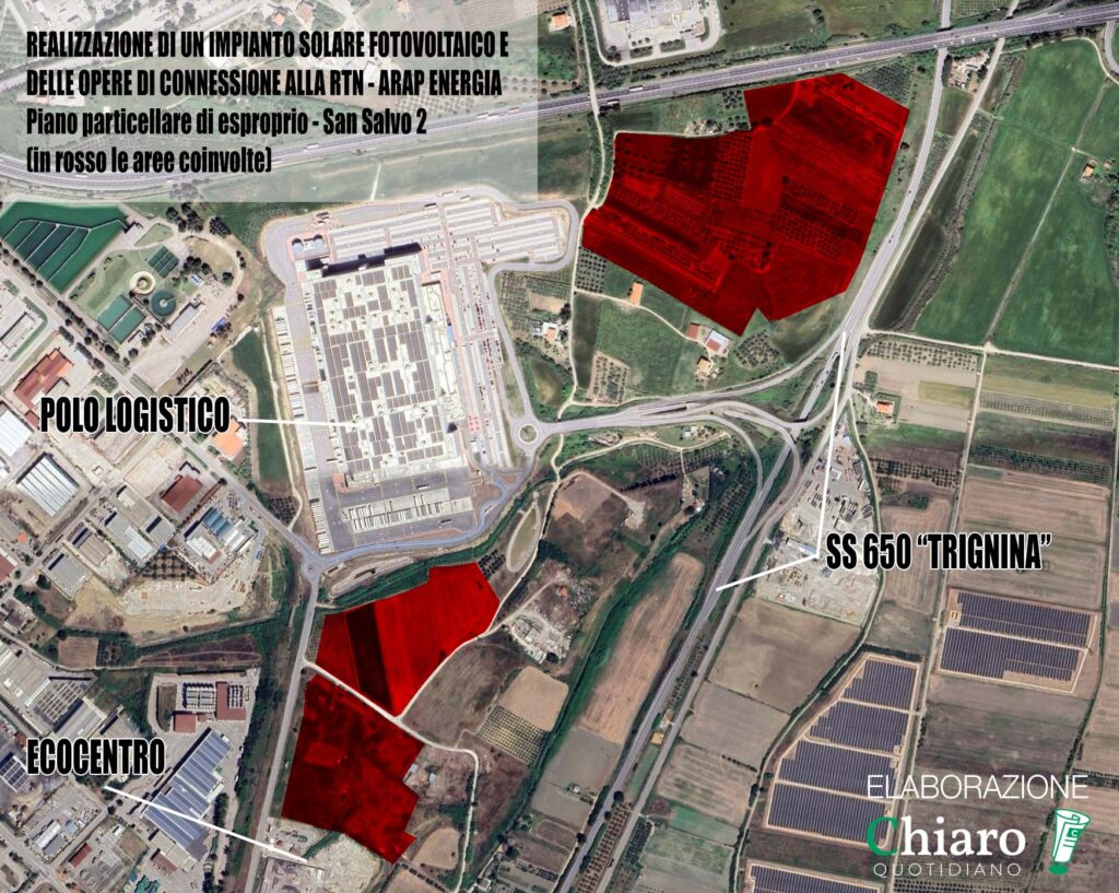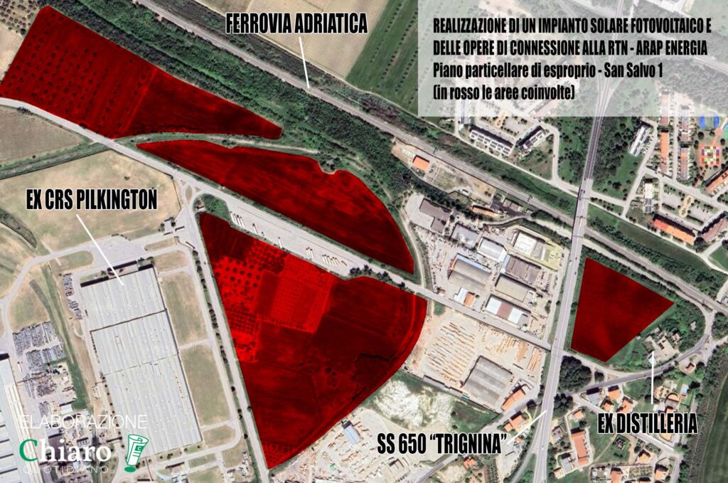 Il primo nucleo solare è stato individuato in ampie fasce di terreno in prossimità dell’ex Crs Pilkington e della Tecnopack. Una di queste fasce si trova tra la ferrovia adriatica e la strada che un giorno dovrebbe essere convertita nella variante alla Statale 16, progetto che potrebbe entrare in conflitto proprio con le intenzioni fotovoltaiche dell’Arap. Un altro lotto inserito nel piano particellare di esproprio è il “triangolo” delimitato dalle due strade che si trova dietro il parcheggio usato dai tir in attesa di caricare dalla fabbrica del vetro. Su questi stessi terreni dovrebbe passare uno degli ultimi tratti della variante prima del raccordo con la Statale “Trignina” [LEGGI].