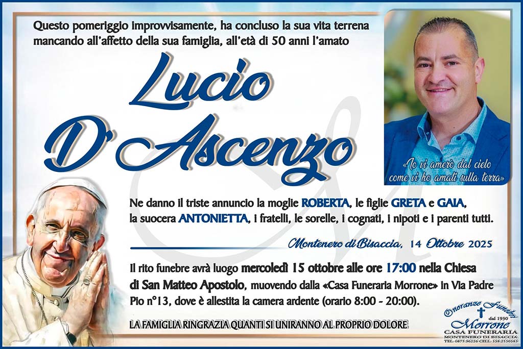 L’ultimo saluto si terrà alle 17 nella chiesa di San Matteo Apostolo a Montenero di Bisaccia. D’Ascenzo lascia la moglie Roberta e le figlie Greta e Gaia. Tra i numerosi messaggi di cordoglio anche quelli delle associazioni podistiche di Vasto e San Salvo.