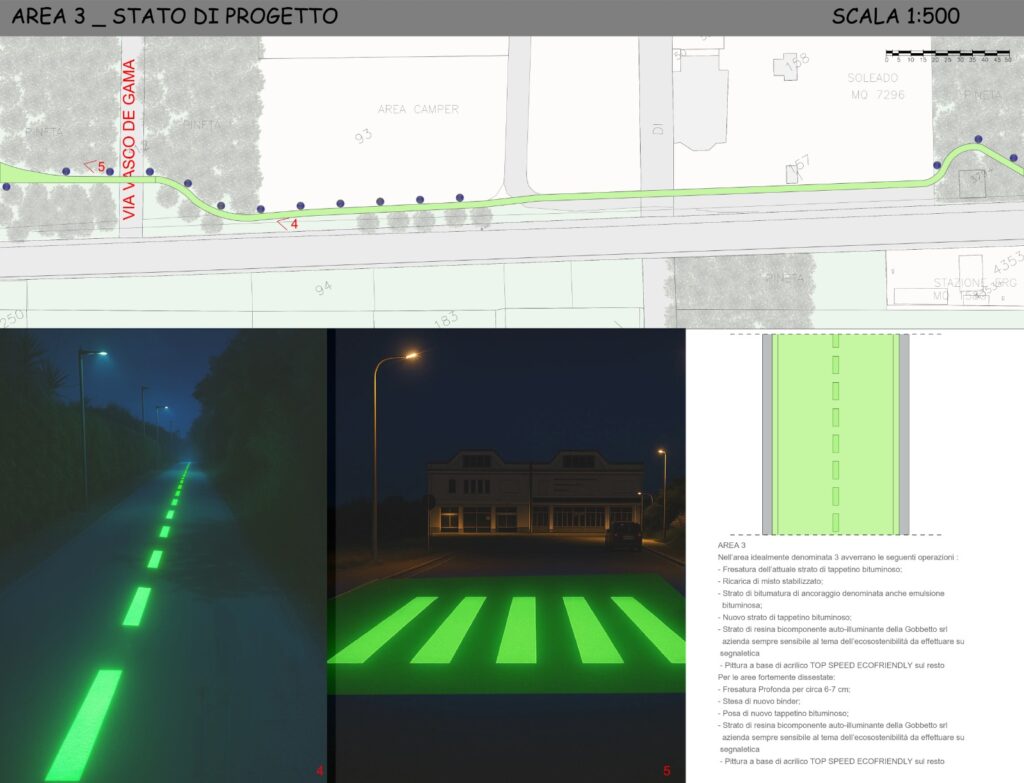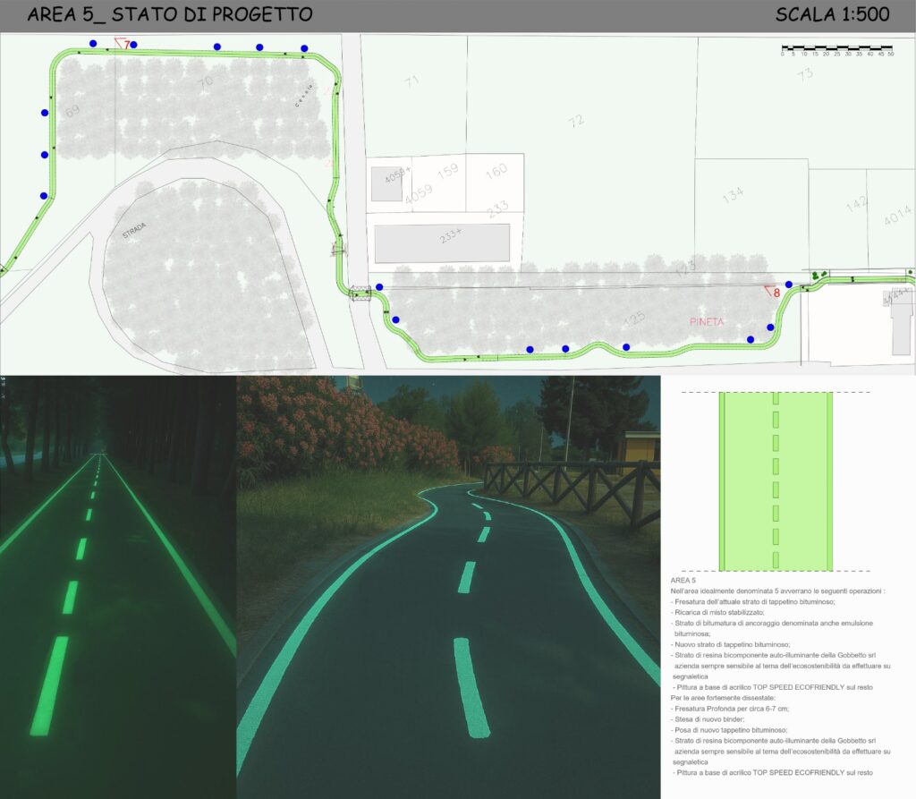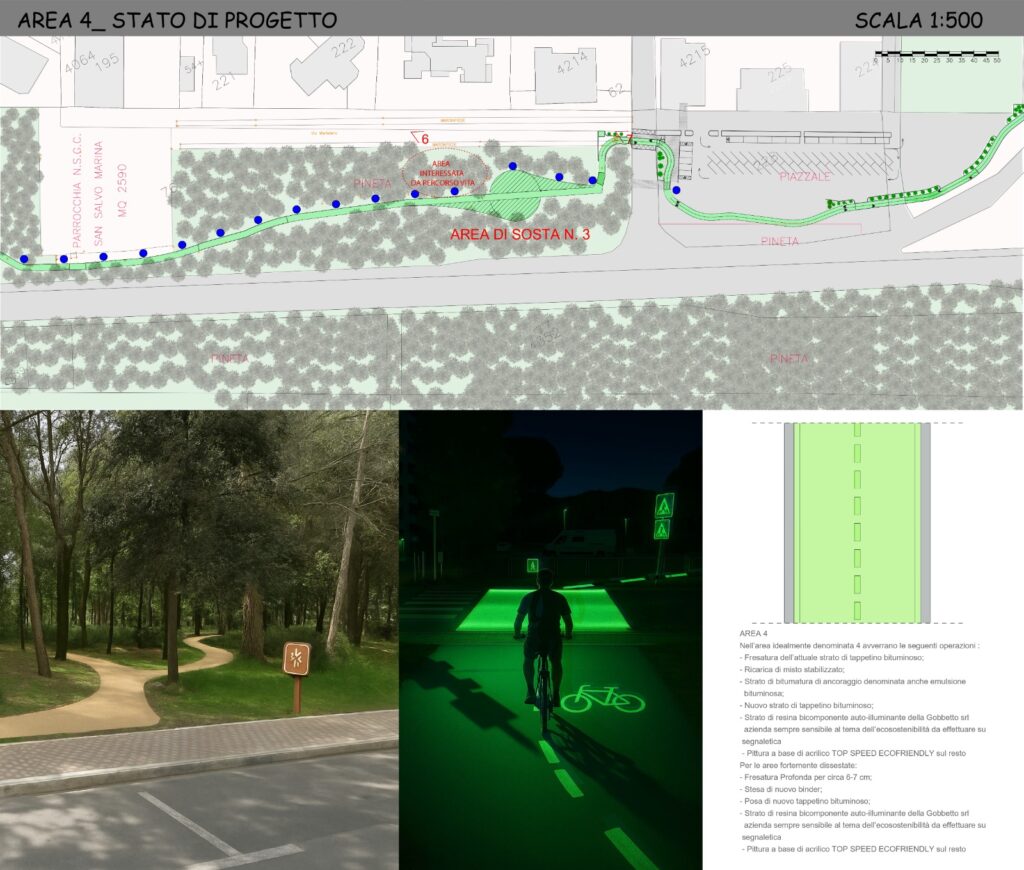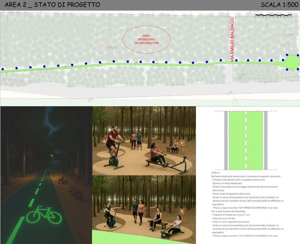«Il progetto, curato dall’architetto Federica Dominique Serafini – si legge in una nota del municipio – prevede il rifacimento del tappetino bituminoso, l’applicazione di resine fluorescenti per aumentare la visibilità notturna e la realizzazione di un percorso vita attrezzato immerso nella pineta, pensato per favorire l’attività fisica all’aperto e promuovere uno stile di vita sano. L’intervento comprende inoltre la posa di nuove panchine e tavoli in legno, una colonnina di manutenzione per biciclette e favorire l’autonomia dei ciclisti, e il miglioramento degli attraversamenti pedonali che collegano la pista con il lungomare di San Salvo Marina, garantendo maggiore sicurezza anche in assenza di illuminazione pubblica. Particolare attenzione è stata riservata all’utilizzo di materiali riciclati e sostenibili, nel pieno rispetto delle normative ambientali e di sicurezza».