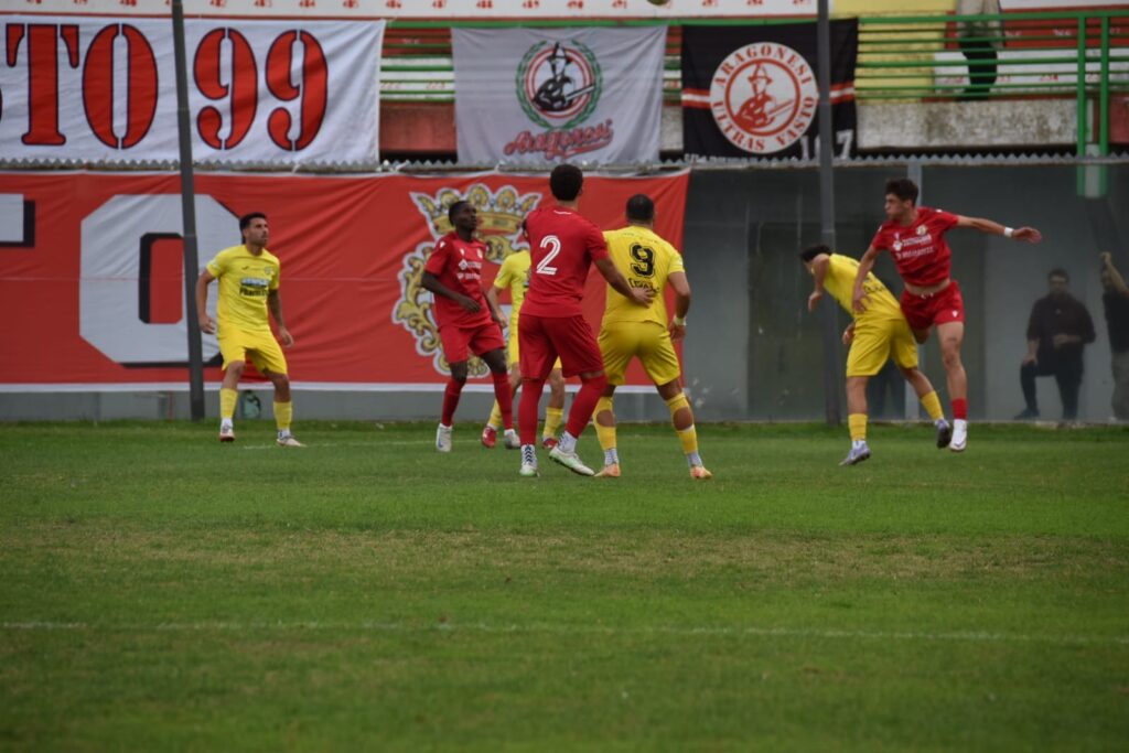 Dopo cento secondi di gioco il primo a provarci è uno dei nuovi arrivi in biancorosso, il centravanti brasiliano Falciano ma il diagonale non è preciso. L’Angolana si affida spesso e volentieri all’estro di Maroto che ci prova all’ottavo ma il giro di destro è facile preda di capitan Cattafesta. Al minuto numero diciassette occasione clamorosa per gli ospiti di giallo vestiti, sulla sinistra Maroto è una spina costante, cross che a centro area non viene raccolto da Santirocco ma sul secondo palo, quasi da zero metri De Berardinis centra la traversa. La Pro Vasto c’è e risponde dieci minuti più tardi, sulla punizione calciata da Morlando si rifugia in angolo Bartiromo, sulla susseguente battuta Farucci impatta ma non trova lo specchio della porta. Gli angolani ci provano ancora, al trentaduesimo quando l’ex di giornata Bouba Diarra, con uno splendido terzo tempo, raccoglie l’assist di De Berardinis ma Cattafesta vola e si rifugia in angolo. I vastesi reggono l’urto alla grande e al trentaseiesimo accendono l’Aragona: poco prima del centrocampo Falciano protegge palla e serve immediatamente Emane che vince il duello contro Sall, s’invola verso la porta e con freddezza batte Bartiromo. Grande gioia per il franco-gabonese classe 2002 che festeggia con una serie di capriole.