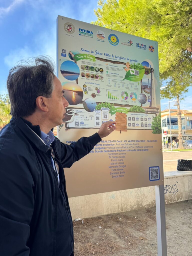 «Sono state realizzate due copie identiche della Mappa di Comunità: una è stata collocata presso il Faro di Punta Penna, l’altra proprio al Parco Suriani, a completare idealmente il progetto. Dietro quest’ultima è stata inoltre installata la copia del pannello ideato dalle studentesse della “R. Paolucci” nell’ambito del progetto “Donne STEM: oltre la barriera di genere”, che racconta la costa vastese da una prospettiva innovativa. Frutto di un accurato lavoro di ricerca e creatività dei ragazzi, la Mappa di Comunità raccoglie 40 punti di interesse legati a storia, tradizioni, monumenti, eventi e luoghi simbolo della costa vastese. È un progetto dinamico e in continua evoluzione, aperto a nuovi contributi e idee per valorizzare il territorio. Fondamentale la guida appassionata di Annamargareth Ciccotosto, che ha accompagnato i giovani nel percorso di scoperta e conoscenza del territorio, insieme a Tiziana Dicembre (guida turistica), Luigi Giuliani ed Elisabetta Zaccaria, che hanno aiutato i ragazzi a comprendere il vero “Genius Loci”, lo spirito dei luoghi vastesi. La Mappa di Comunità non è solo un progetto, ma un abbraccio collettivo al territorio, un segno tangibile dell’amore che i ragazzi e gli adulti hanno saputo intrecciare per la loro terra. Ogni punto segnato, ogni storia raccolta, ogni sogno immaginato, racconta un legame vivo tra passato e futuro, tra mare e cuore. Perché prendersi cura di un luogo significa prendersi cura di chi lo abita, e continuare a credere che la bellezza possa rigenerare le persone e le comunità».