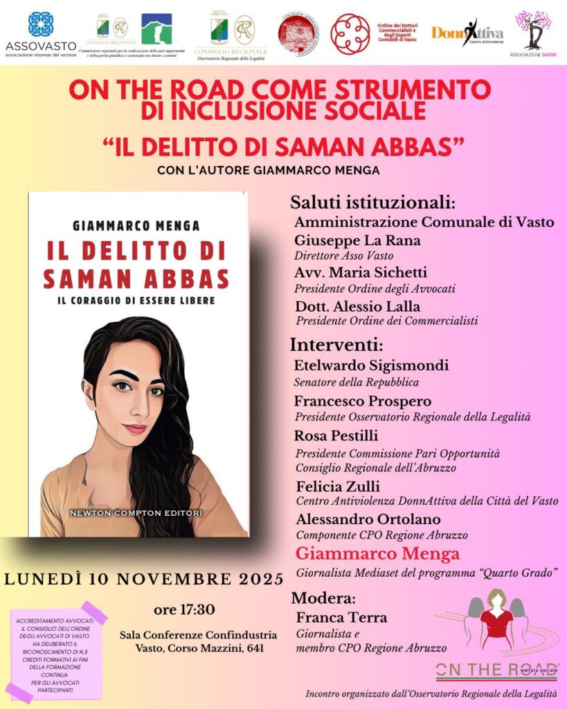 «A Vasto l’autore Gianmarco Menga ospite dell’evento promosso dall’Osservatorio Regionale della Legalità e dalla Commissione Pari Opportunità Un appuntamento di grande valore civile e culturale per riflettere sul coraggio, sulla libertà e sulla dignità delle donne. Lunedì 10 novembre 2025, alle ore 17:30, presso la Sala Conferenze di Confindustria Vasto (Corso Mazzini, 641), si terrà l’incontro On The Road come strumento di inclusione sociale – Il delitto di Saman Abbas, con la partecipazione straordinaria del giornalista e autore Gianmarco Menga, volto del programma televisivo Quarto Grado in onda su Rete 4». Lo comunica una nota della Regione.