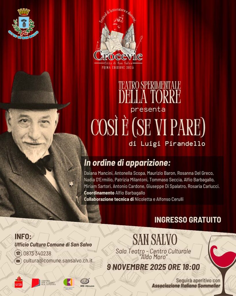 La compagnia Teatro Sperimentale della Torre porterà in scena, domenica 9 novembre (ore 18), lo spettacolo Così è (se vi pare) di Luigi Pirandello nella sala teatro del centro culturale ‘’Aldo Moro” di San Salvo; l’ingresso è gratuito. L’iniziativa si inquadra all’interno del Festival di Letteratura e dintorni – Crocevie.