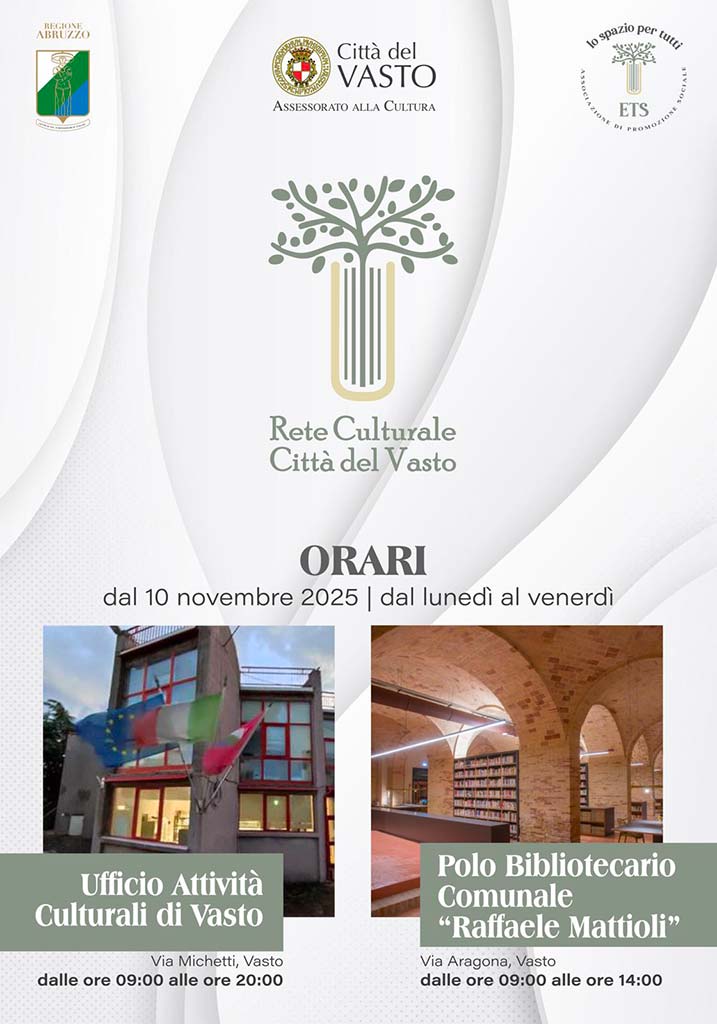 Cresce la Rete Culturale della Città del Vasto che Comune, Regione e Lo spazio per tutti hanno varato nei mesi scorsi a seguito di un accordo istituzionale. Da oggi, 10 novembre, sono in vigore i nuovi orari dal lunedì al venerdì: l’ufficio Attività culturali di via Michetti sarà aperto dalle 9 alle 20, mentre il Polo bibliotecario comunale “Raffaele Mattioli” di via Aragona dalle 9 alle 14.