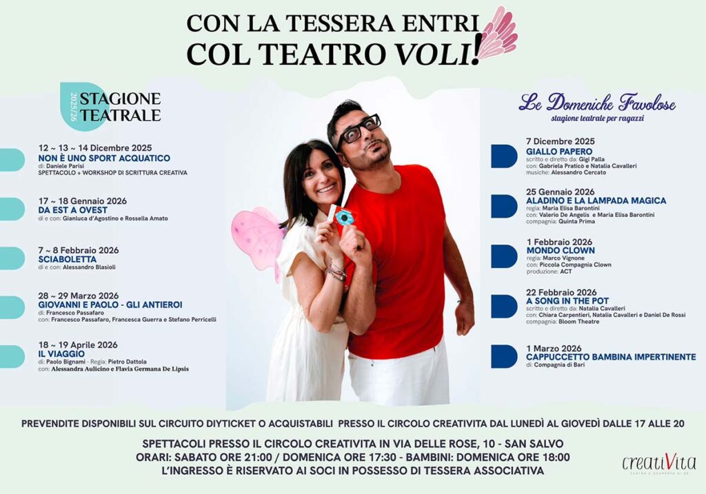 Il 7 dicembre, negli spazi del circolo-teatro di via delle Rose 10 a San Salvo, si apre ufficialmente la sesta stagione di prosa di Creativita: appuntamento atteso, che torna con passione rinnovata, qualità artistica e un ricco programma per coinvolgere pubblici di tutte le età.