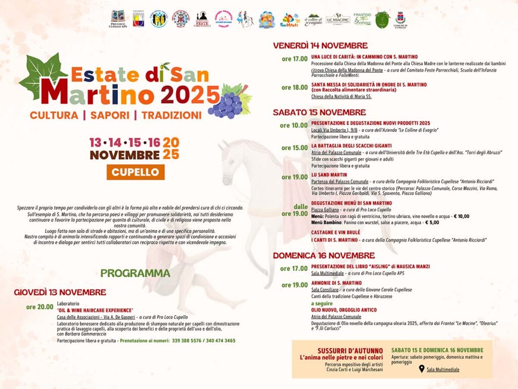 Da giovedì 13 a domenica 16 novembre Cupello si prepara a vivere la magia dell’Estate di S. Martino, quattro giorni che uniscono sapori autentici, cultura popolare e momenti di condivisione. Dopo il successo delle edizioni precedenti, associazioni e produttori locali tornano a fare squadra per offrire un programma ancora più ricco e coinvolgente.