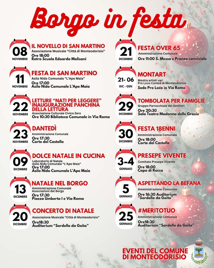 In una nota, il Comune sottolinea che l’evento clou sarà Natale nel borgo, in programma il 13 dicembre: «Vi aspetta un pomeriggio e una serata ricchi di atmosfera: mercatini di Natale con tante idee regalo originali, il meraviglioso Musical di Frozen, Street Band che accompagneranno un gustoso percorso enogastronomico, l’immancabile accensione dell’albero di Natale con i bambini che avranno l’opportunità di incontrare l’unico e inimitabile Babbo Natale».