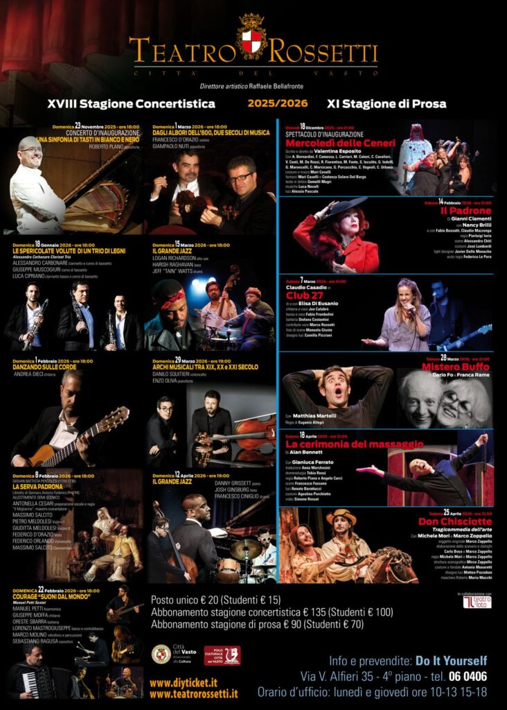 «Soltanto una settimana ci separa dal Concerto di inaugurazione della Stagione Concertistica (domenica 23 novembre alle ore 18:00) che avrà l’onore di accogliere Roberto Plano, uno dei più apprezzati pianisti sulla scena internazionale», dichiarano il Presidente e il Direttore Artistico del Polo Culturale della Città del Vasto, Annamaria Di Paolo e Raffaele Bellafronte. «Poi, secondo il calendario, presenze illustri provenienti da tutto il mondo si alterneranno sullo storico palco del Teatro Rossetti e, come da tradizione consolidata, tanti saranno i linguaggi della musica proposti: dalla musica ‘colta’ al Jazz e alla world music con una infinità di sfumature diverse».