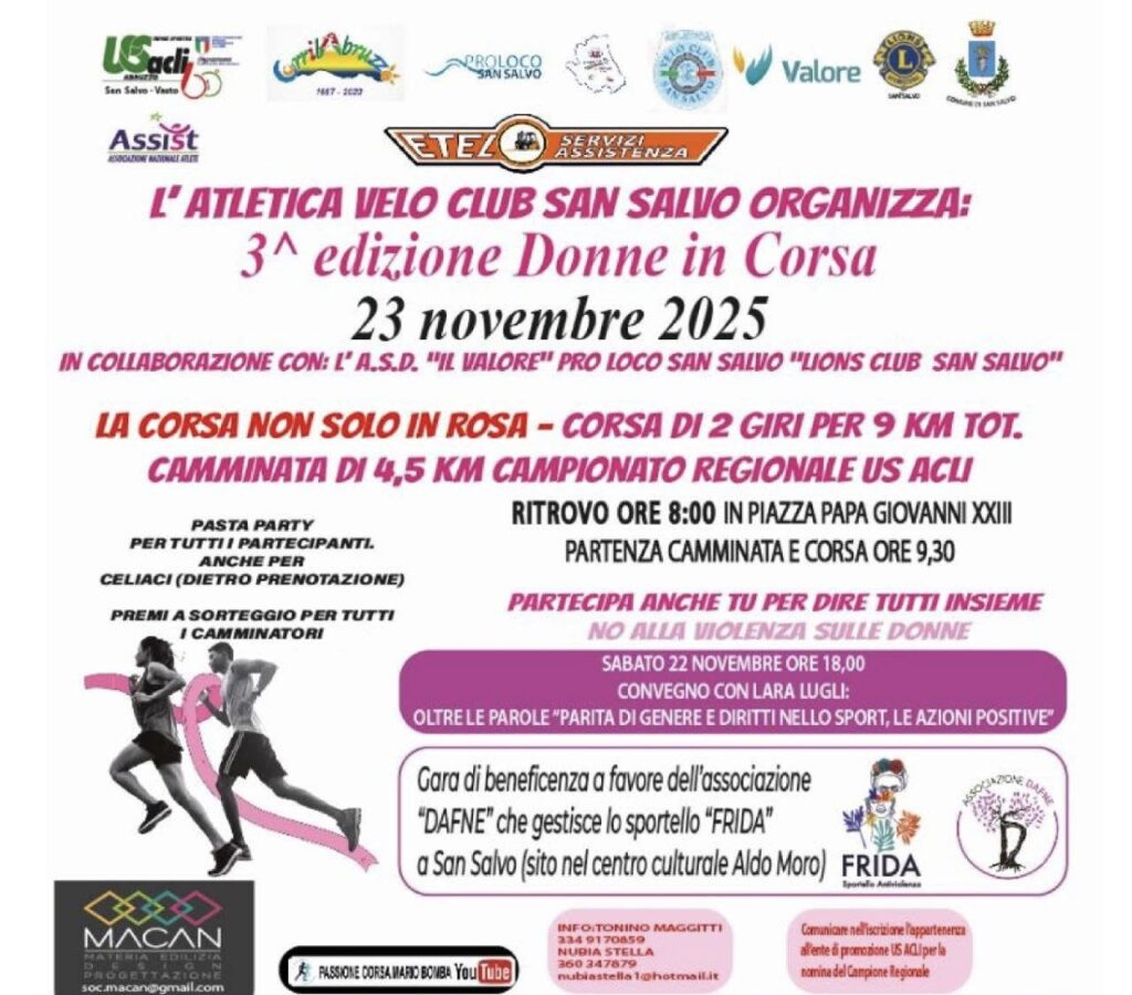 Venerdì 14 novembre, nella Sala Consiliare del Comune di San Salvo, sono stati presentati ufficialmente i tre eventi della rassegna “Donne in Corsa”, organizzata dall’Atletica Velo Club San Salvo. L’incontro ha messo in evidenza il valore della collaborazione tra istituzioni, scuole e associazioni del territorio, con l’obiettivo di unire sport e sensibilizzazione sociale.