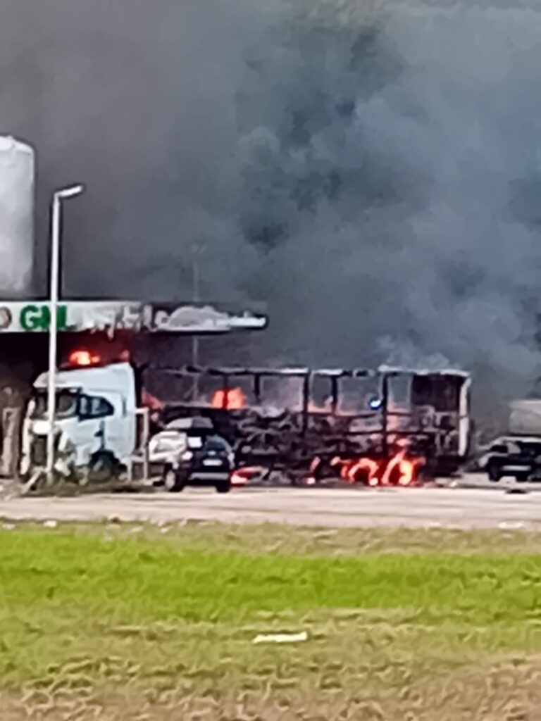 Ore 17.00 – L’incendio è stato definitivamente spento. Da accertare le cause che hanno causato il rogo. Parzialmente danneggiata la pensilina della piazzola di rifornimento, l’intervento provvidenziale dei vigili del fuoco ha evitato danni peggiori. Si attende la riapertura della strada.