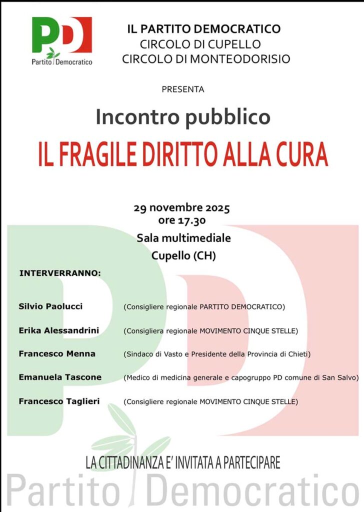 Si intitola Il fragile diritto alla cura l’appuntamento organizzato dai circoli del Pd di Cupello e Monteodorisio. Si terrà il 29 novembre, ore 17.30, nella sala multimediale del Comune di Cupello.