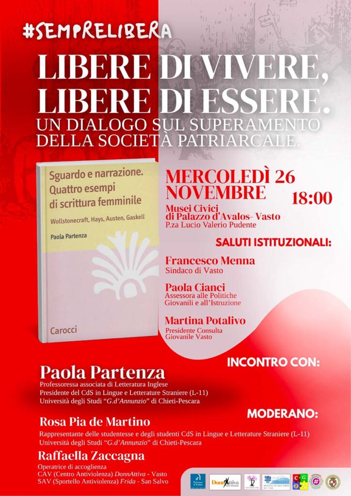 Martedì 26 novembre, alle ore 18, nella Sala dei musei civici di Palazzo d’Avalos, si terrà la presentazione del libro Sguardo e narrazione, quattro esempi di scrittura femminile, un dialogo sul superamento della società patriarcale con Paola Partenza, associata Lettura inglese e presidente del corso di studio in Lingue e letterature straniere all’Università degli Studi “G. d’Annunzio” di Chieti-Pescara.