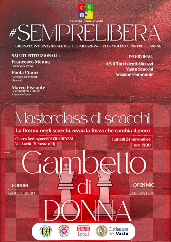 Le iniziative di quest’anno inizieranno il 24 novembre con Gambetto di donna-Masterclass di scacchi, alle ore 18.30 al centro “Enrico Berlinguer” in via Anelli, 71: un evento formativo e simbolico, realizzato in collaborazione con Vasto Scacchi-Torri degli Abruzzi. Il titolo richiama una celebre apertura scacchistica, trasformandola in metafora di strategia, intelligenza e autodeterminazione femminile: «L’iniziativa mira a promuovere la cultura della parità attraverso il gioco degli scacchi, offrendo uno spazio educativo e aggregativo rivolto a giovani, adulti e famiglie». L’ingresso è libero.