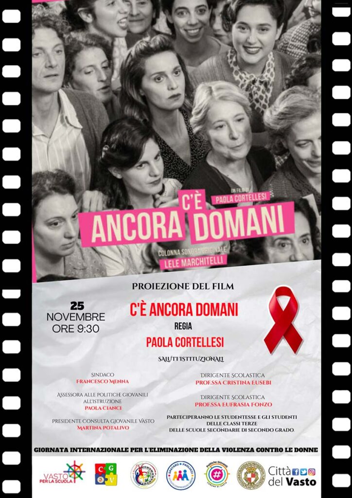 Nel giorno della ricorrenza, martedì 25 novembre, le classi terze delle scuole secondarie di primo grado parteciperanno alla proiezione del film C’è ancora domani di Paola Cortellesi, nell’ambito del percorso Scuola al Cinema per la legalità; parteciperanno, per i saluti istituzionali, il sindaco Menna, l’assessora Cianci, le dirigenti scolastiche Cristina Eusebi ed Eufrasia Fonzo e la presidente della Consulta giovanile Martina Potalivo.