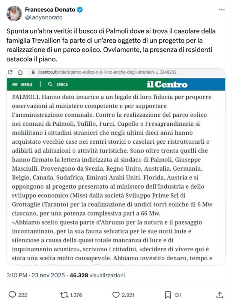 La presunta correlazione tra eolico e vicenda famigliare ha iniziato a circolare da qualche giorno, rilanciata anche da numerosi e seguiti account social. Tra questi, il 23 novembre, l’ex europarlamentare, eletta da indipendente nella Lega, Francesca Donato, che su X come “prova” esibisce un vecchio articolo de Il Centro sul progetto scrivendo «Spunta un’altra verità: il bosco di Palmoli dove si trova il casolare della famiglia Trevallion fa parte di un’area oggetto di un progetto per la realizzazione di un parco eolico. Ovviamente, la presenza di residenti ostacola il piano». Un post, questo, con oltre 46mila visualizzazioni e rilanciato da altri 1.376 utenti.