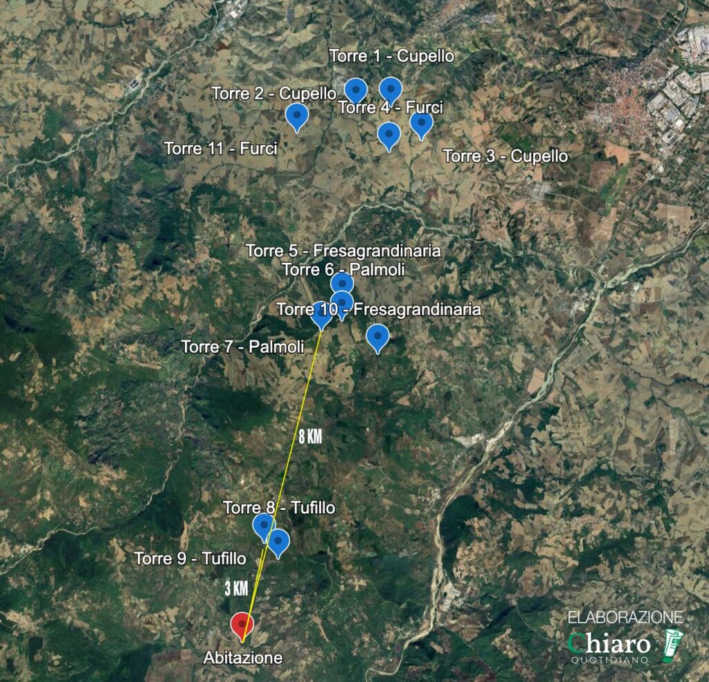 Il progetto citato è stato presentato al ministero dell’Ambiente e della sicurezza economica il 28 novembre 2023 (e non nel 2024) ed è ancora in fase di valutazione. Sono previste 11 torri eoliche, delle quali due in territorio di Palmoli: la più vicina di quelle palmolesi si trova a oltre 8 km dall’abitazione della famiglia Trevallion-Birmingham (altro che «coincidenza territoriale»). La distanza scende a circa 3 km se si prende in esame la torre eolica più vicina, in territorio di Tufillo.