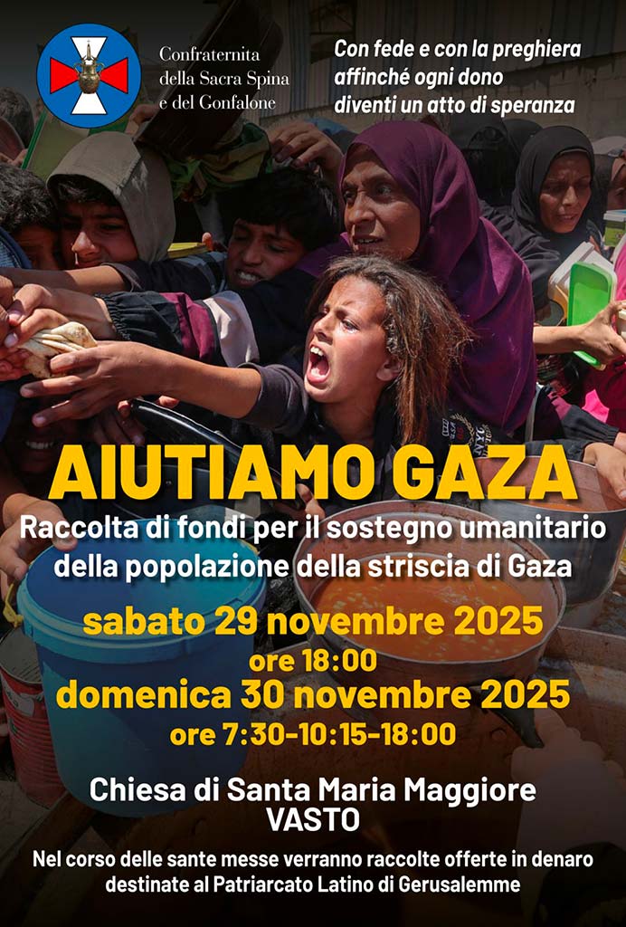 La Confraternita della Sacra Spina e Gonfalone di Vasto organizza sabato 29 e domenica 30 novembre, una raccolta di fondi per la popolazione di Gaza: «In questa prima domenica d’Avvento vogliamo, con il sostegno dei fedeli della Parrocchia di Santa Maria Maggiore, dare un aiuto concreto per ricostruire vite spezzate. La popolazione civile della striscia di Gaza sta affrontando una delle crisi umanitarie più gravi degli ultimi decenni».