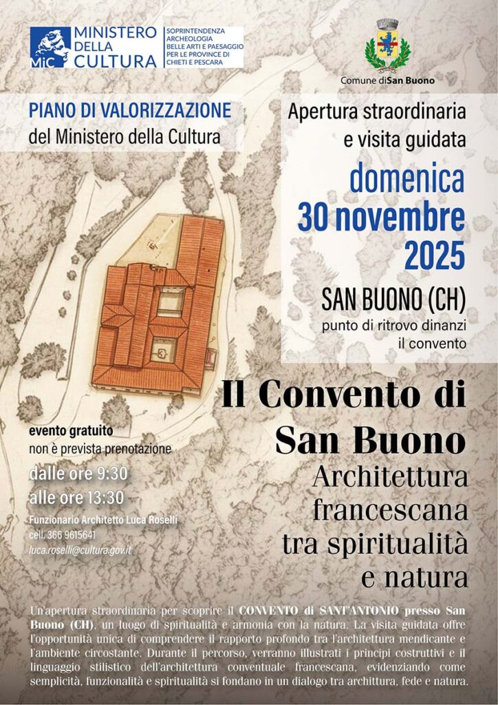 Il giorno dopo, domenica 30 novembre, toccherà a Il convento di San Buono. Architettura francescana tra spiritualtà e natura. L’evento gratuito, organizzato dal Comune di San Buono, s’inquadra nel piano di valorizzazione del ministero della Cultura e prevede, dalle 9.30 alle 13.30, l’apertura straordinaria con visita guidata dell’antico e suggestivo convento dedicato a Sant’Antonio.