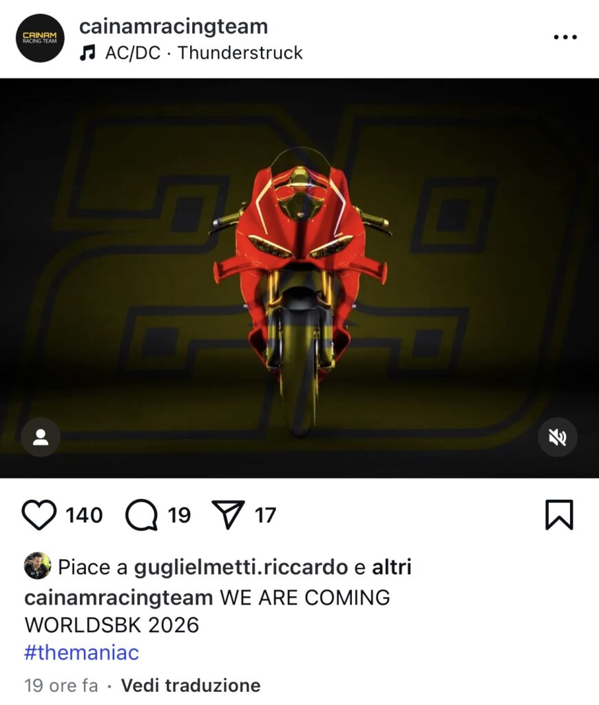 Su Instagram, come perfettamente raccontato dall’esperto collega Riccardo Guglielmetti del sito Gpone.com, è nata una nuova pagina, quella del nuovissimo team “Cainam Racing Team”. Mistero dietro questa realtà ma, come evidenziato da Guglilmetti, leggendo il nome al contrario leggiamo “Maniac”, il soprannome di Iannone. La moto che dovrebbe accompagnarlo dovrebbe essere ancora una Ducati V4, nelle “bio” di Instagram del neonato team si legge:” WorldSBK 2026 – The Maniac”.
