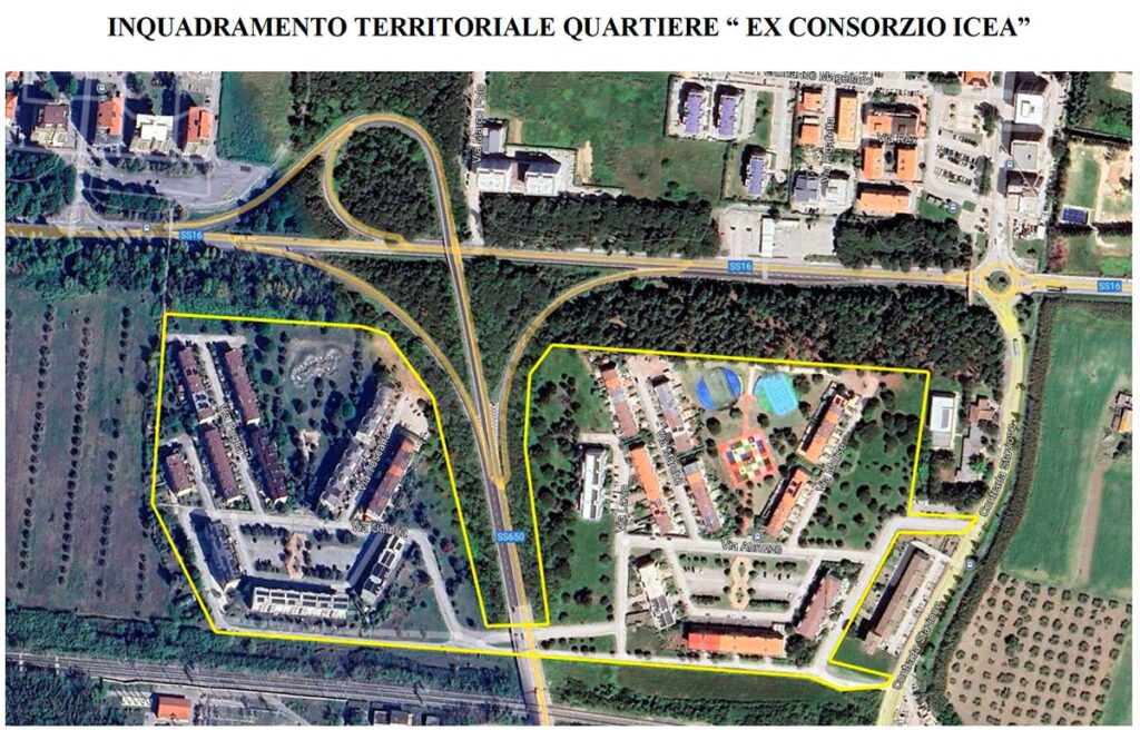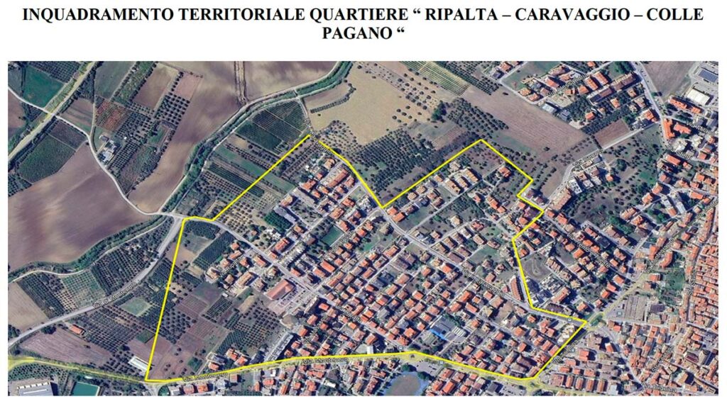 Via il Caravaggio, via Tiepolo, via L. della Robbia, via Ripalta, via Borromini, via Masaccio, via L. Alberti, via Tintoretto, via Brunelleschi, via Bramante, via P. della Francesca, via Michelangelo, via Segantini, via Juvara, via Nervi, via Michetti, via Botticelli, via il Pinturicchio, c.da S. Vitale, c.da Colle Pagano