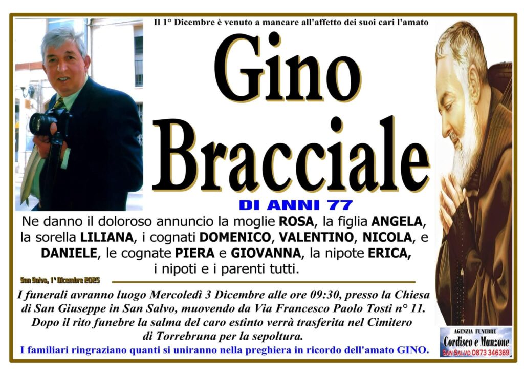 Se n’è andato all’età di 77 anni, Gino Bracciale, vera e propria memoria con la sua inseparabile fotocamera della storia di San Salvo; il suo studio nel centro, in corso Garibaldi, da sempre un punto di riferimento.