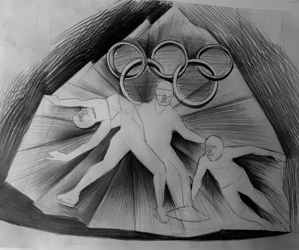 Il disegno presenta tre figure umane stilizzate, slanciate e in movimento, simbolo dell’energia degli atleti impegnati negli sport invernali. Accanto ai corpi si stagliano in rilievo i cinque cerchi olimpici, a richiamare unità e fratellanza tra i popoli. Linee curve e giochi di profondità evocano velocità e fluidità, rimandando a discipline come sci, pattinaggio e snowboard.