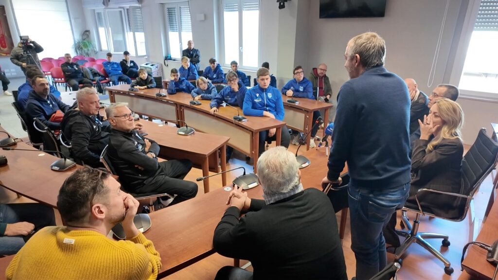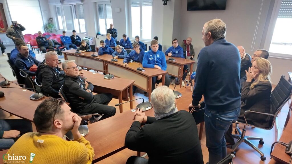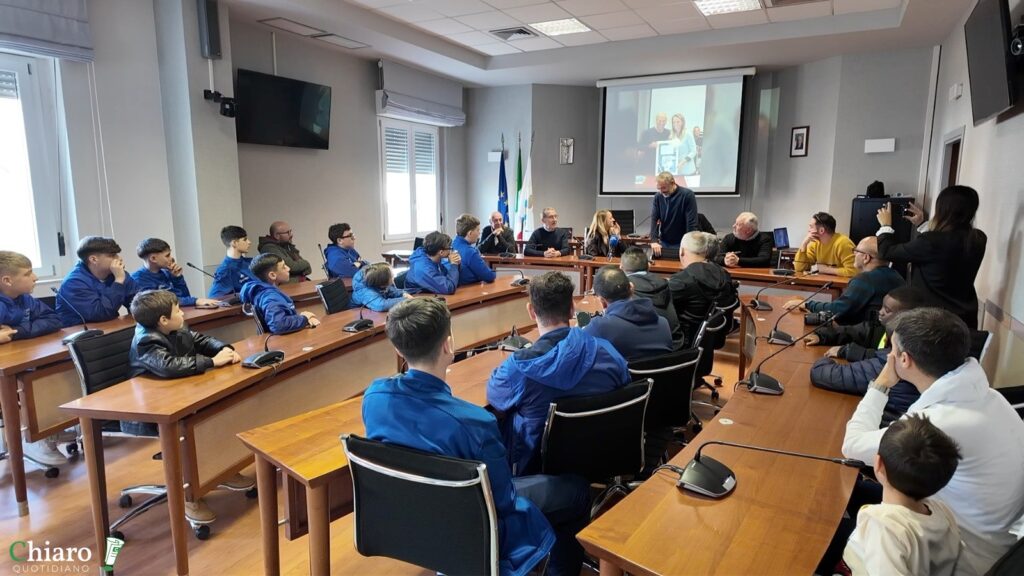 Nell’aula consiliare del Comune di San Salvo, ad attendere Giampaolo baby calciatori, accompagnati dai loro allenatori e alcuni genitori, dei settori giovanili dell’Asd San Salvo e degli Aquilotti San Salvo. Una chiacchierata lunga oltre un’ora con il cinquattottenne tecnico di Giulianova presentato dal sindaco Emanuela De Nicolis, il vice sindaco Eugenio Spadano insieme agli assessori Faga e Travaglini. Le prime domande poste dalla De Nicolis, poi è stato il turno di Spadano passando per gli allenatori presenti e le curiosità dei baby calciatori emozionati nel trovarsi di fronte a un allenatore di grande esperienza.