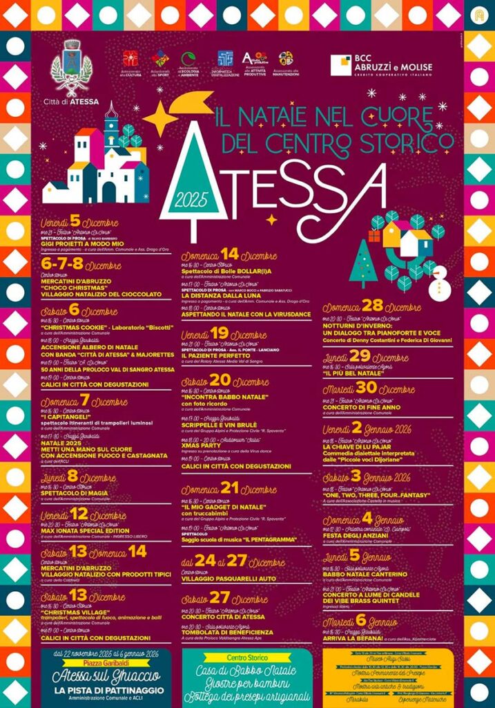 Atessa è pronta a immergersi nell’atmosfera del Natale con il cartellone 2025: un programma ricco di eventi, tradizione, gusto e spettacolo che animerà il centro storico dal 5 dicembre 2025 al 6 gennaio 2026. Il programma è pensato per coinvolgere famiglie, bambini, turisti e cittadini, valorizzando le eccellenze del territorio.