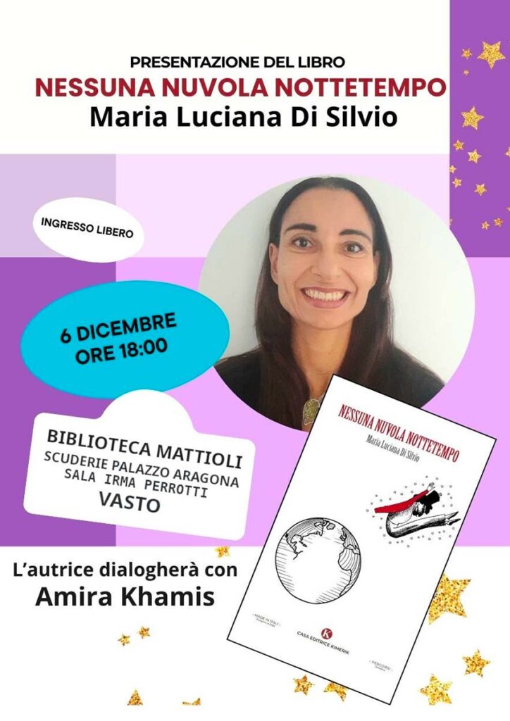 Sabato 6 dicembre, sarà presentato, a Vasto, Nessuna nuvola nottetempo, il libro di Maria Luciana Di Silvio. Alle 18, con ingresso libero, l’autrice dialogherà con Amira Khamis nelle scuderie di Palazzo Aragona (sala “Irma Perrotti”).