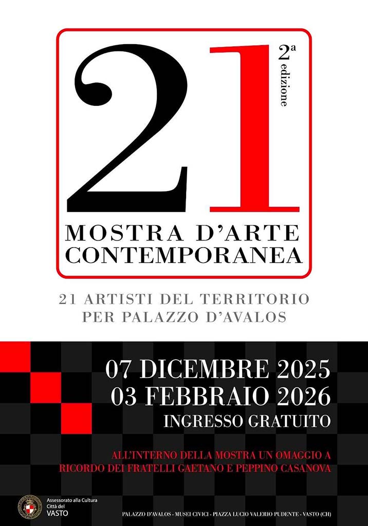 I musei civici di Palazzo d’Avalos tornano ad accogliere la mostra d’arte contemporanea 21. L’esposizione, patrocinata dal Comune di Vasto e curata da Giuseppe Muzii, sarà aperta dal 7 dicembre 2025 (inaugurazione alle ore 18) fino al 3 febbraio 2026, con ingresso gratuito. Protagonisti dell’iniziativa, alla seconda edizione, ventuno artisti locali, selezionati per mettere in luce il talento e la creatività della nostra comunità.