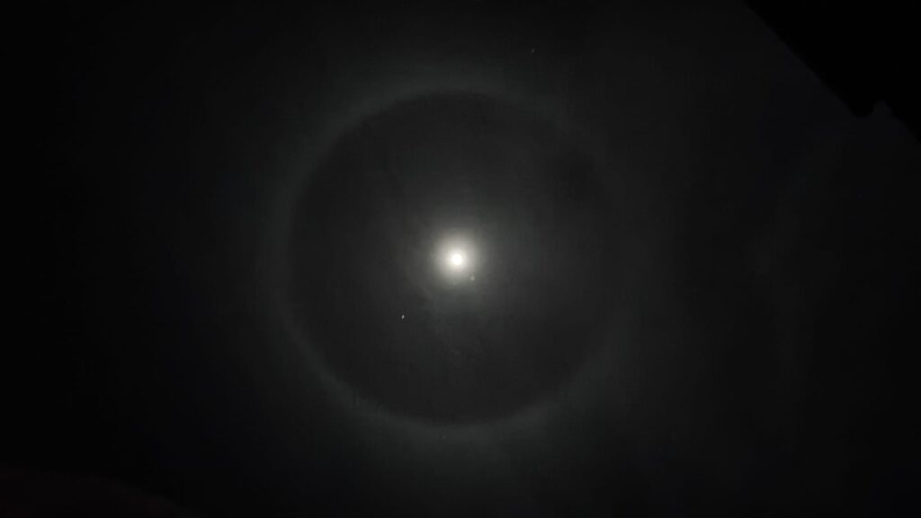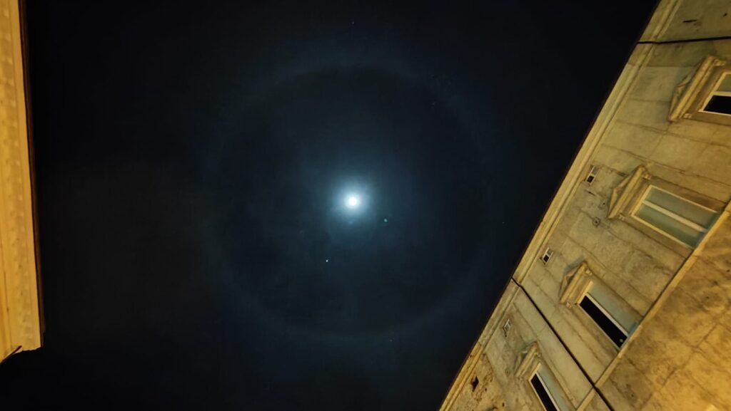 Il nome scientifico è “Anello 22 gradi”. Si tratta di un alone attorno alla Luna. È fatto di cristalli di ghiaccio.