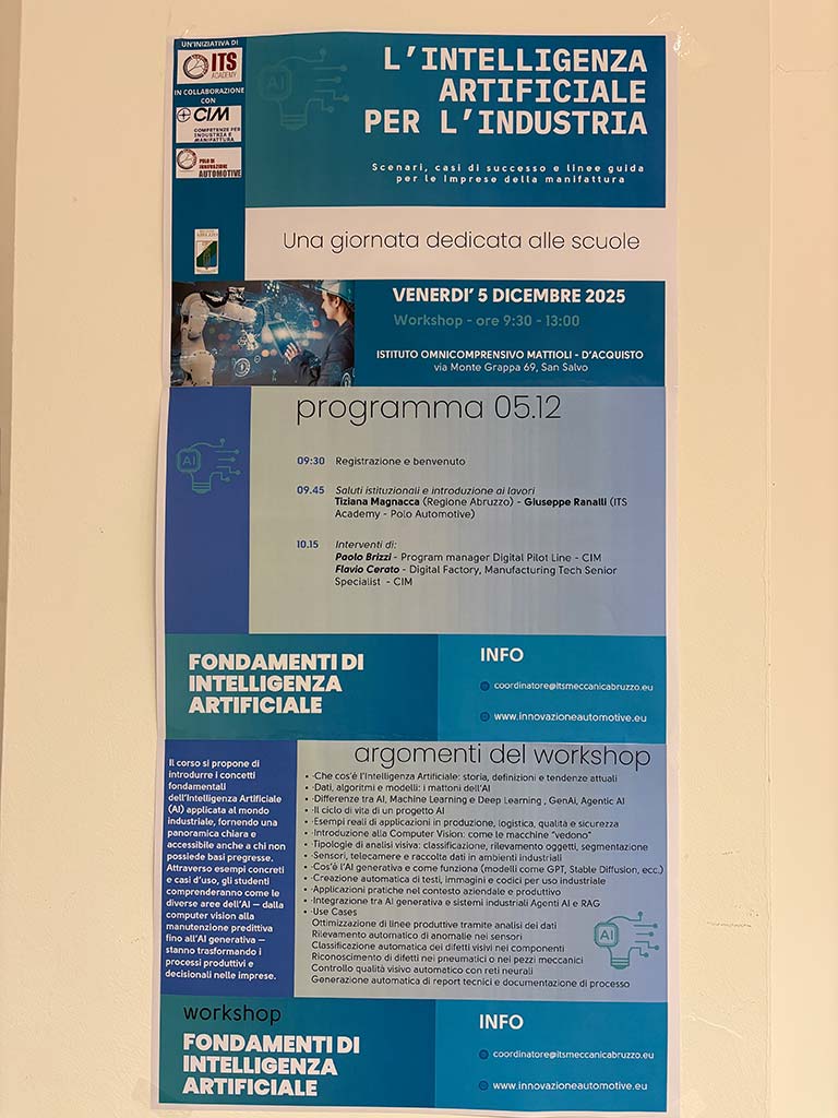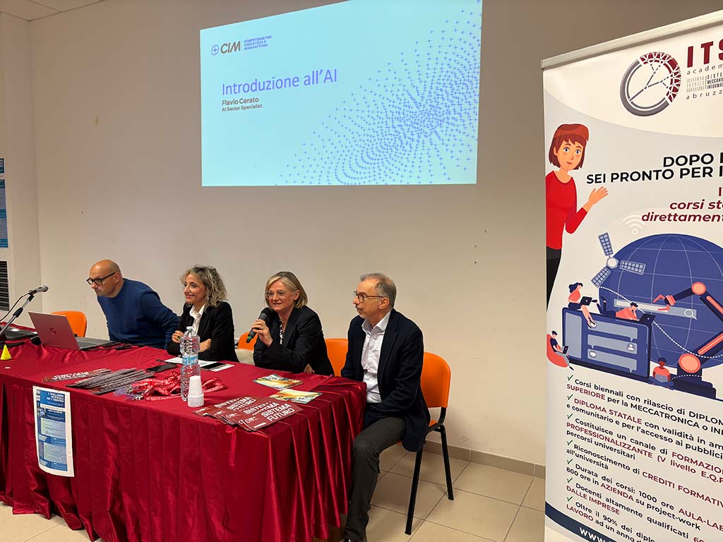 All’interno dell’evento, coordinato del direttore Its, Antonio Maffei, è stato strutturato il workshop Fondamenti di Intelligenza Artificiale, condotto da Flavio Cerato (Digital Factory – Manufacturing Tech Senior Specialist del Cim) e Paolo Brizzi (Program Manager della Digital Pilot Line del Cim). Interessata e propositiva la partecipazione delle classi 4ª e 5ª Manutenzione e Assistenza tecnica e 5ªA e 5ªB Liceo scientifico dell’istituto ospitante, insieme ad altre classi quinte dell’Itis “Palizzi-Mattei” di Vasto e dell’Iis “Da Vinci-De Giorgio” di Lanciano: una conferma della crescente rete territoriale tra scuole tecniche e scientifiche e mondo del lavoro.