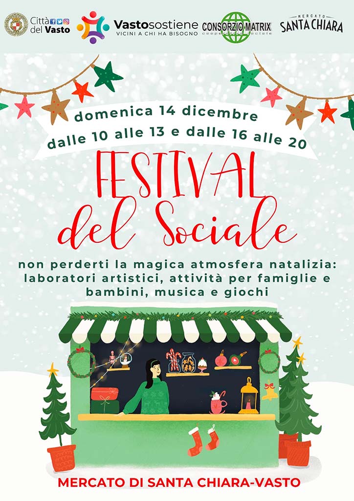 Il mercato Santa Chiara si prepara ad accogliere il Festival del Sociale, una giornata dedicata alla solidarietà, alla partecipazione e alla scoperta del prezioso lavoro svolto dalle realtà associative del territorio. L’evento, promosso dal Comune di Vasto, dal Consorzio Matrix e dal mercato di Santa Chiara, nasce con l’obiettivo di avvicinare la cittadinanza al mondo del volontariato, valorizzando il ruolo fondamentale delle associazioni che ogni giorno operano per il benessere della comunità.