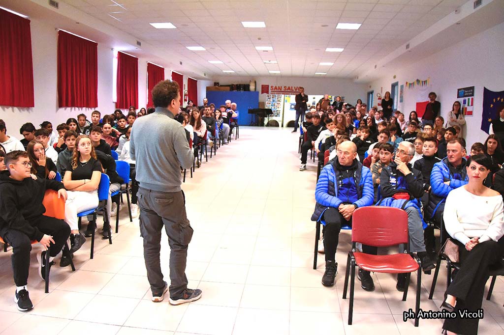 Dopo i saluti istituzionali della dirigente scolastica Anna Rosa Costantini, del comandante della polizia municipale Antonio Persich, del presidente del Lions Club Virginio Di Pierro, del presidente dell’Asd Ciclistica Rocchino Bucci e dell’officer distrettuale Antonio Plescia, la mattinata è entrata nel vivo con gli interventi emozionanti e coinvolgenti di Marco Scarponi (Fondazione Michele Scarponi) e del giornalista Marco Pastonesi, che hanno saputo conquistare l’attenzione dei ragazzi con testimonianze profonde e cariche di significato.