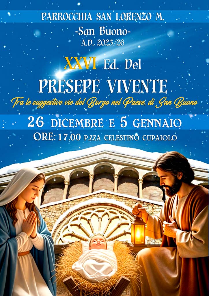 Il presepe vivente di San Buono spegnerà quest’anno ventisei candeline. La suggestiva rappresentazione della Natività nel centro storico del paese si terrà in due date: il 26 dicembre e il 5 gennaio (sempre alle ore 17).